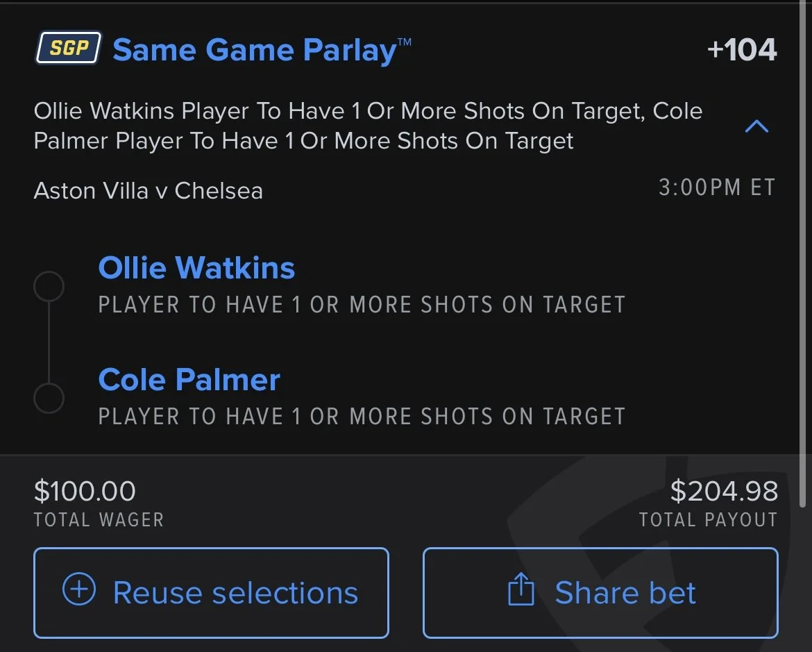 Ollie Watkins & Cole Palmer 1+ shot on goal (+104)