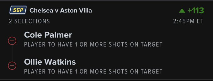 Little late addition to the day but I think I have to play this, both guys are starting at striker for their respective teams and both guys love to get shots up. Palmer has gotten 1+ shot on goal in 11 of his L14 games and has 16 shots on goal in those L14 games. Lastly, Palmer has 7 shots on goal in his L4 Carabao Cup games. Watkins has been a shot machine this whole season with 1+ shot on goal in 18 of 21 Premier League games this season. Watkins also has a total of 24 SOG in those 21 EPL games. Lastly Watkins has managed 21 shots on goal in his L17 games.