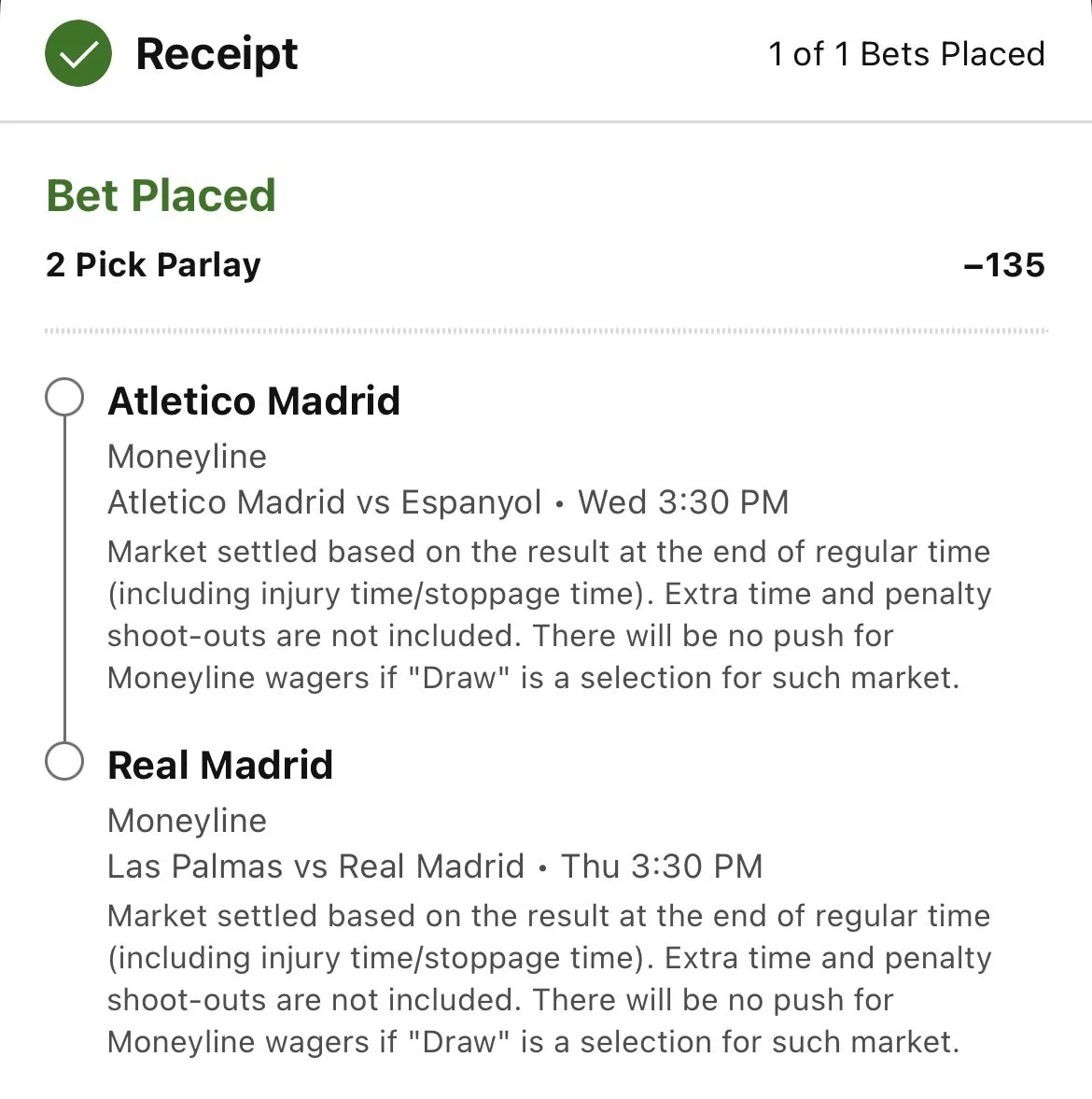 Backing a two leg parlay between the two Madrid teams that I bet this past weekend, Atletico and Real. Atletico plays Wednesday at 3:30 PM and Real plays Thursday at 3:30 PM, so you will need to have a little patience for this but it will pay off.