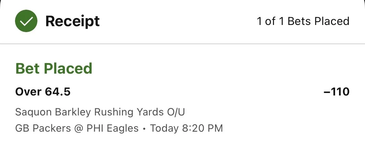 Backing Barkley in his first game as an Eagle to top his rushing prop tonight. We saw Derrick Henry in his first game as a Raven fall short of his rushing prop by about 20 yards in a very similar position, but I think Philadelphia will rely on the run game a bit more than Baltimore. Not to mention Saquan is a better running back than Henry, hot take but it’s true.