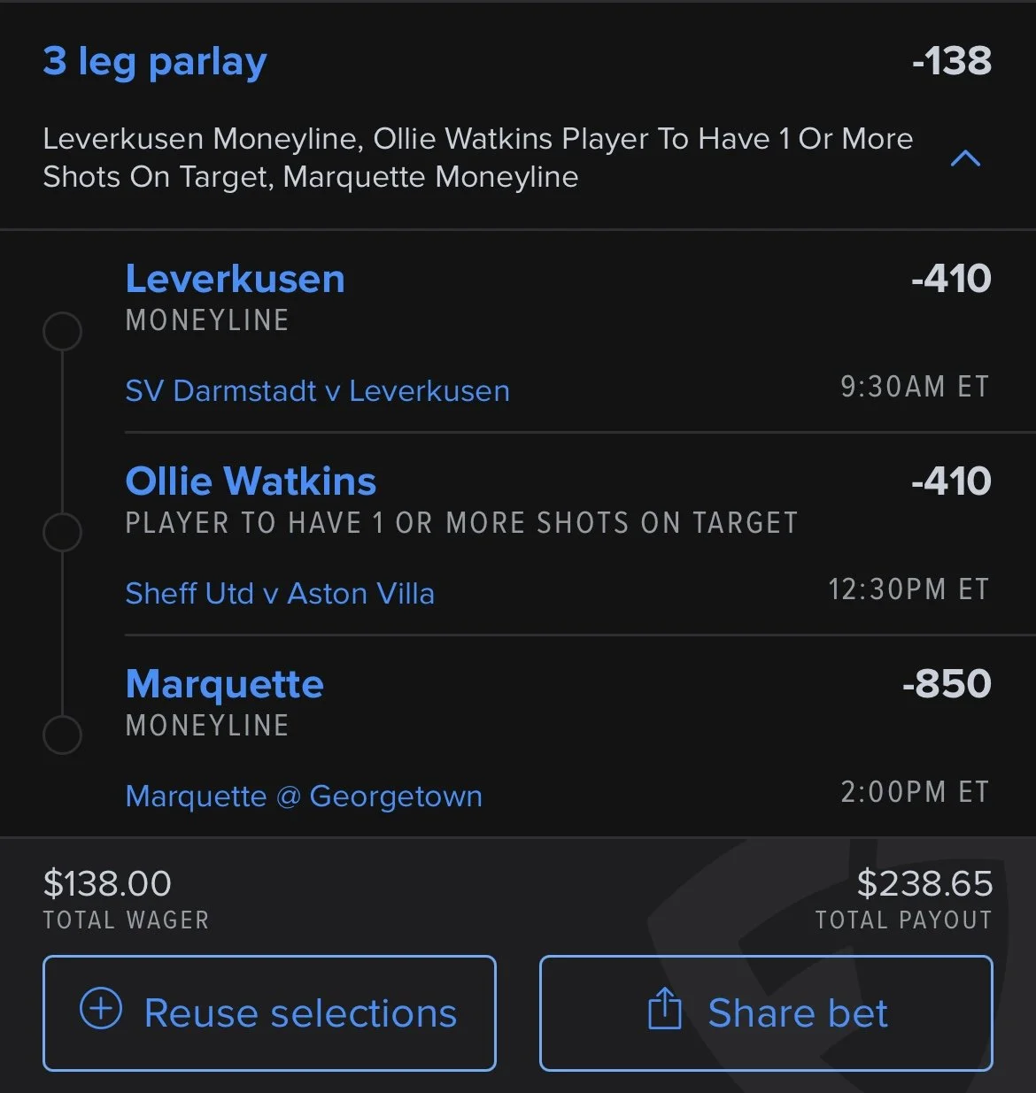 Bayern Leverkusen ML/Marquette ML/Ollie Watkins 1+ shot on goal (-138)